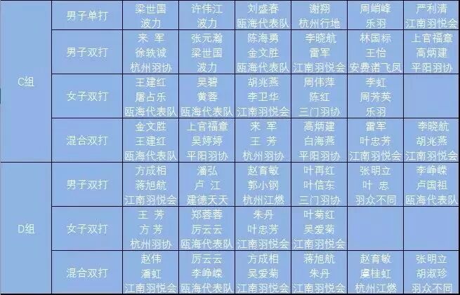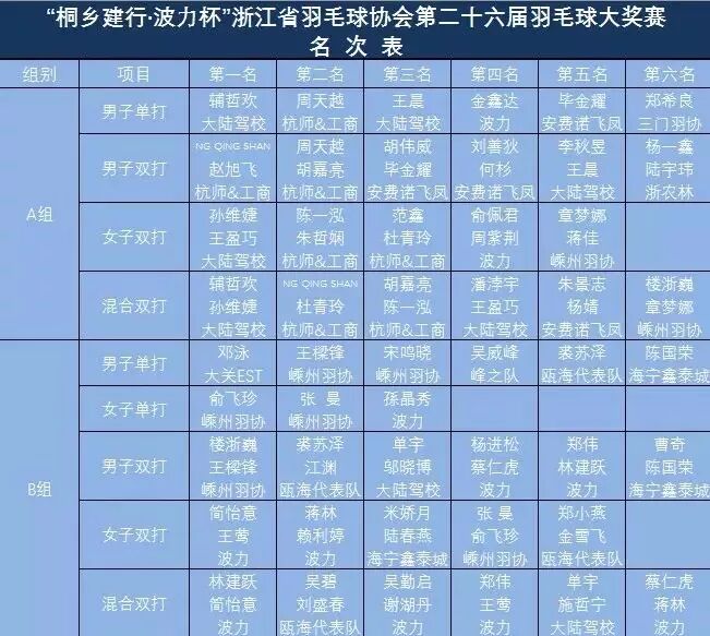 团体总分第一至八名分别为:波力俱乐部,瓯海区代表队,大陆驾校羽毛球俱乐部,江南羽悦会,杭师&工商,嵊州市羽毛球协会,安费诺飞凤,杭州市羽毛球协会。